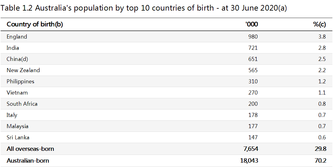 根據澳大利亞統計局發布的最新《澳洲人口統計》報告顯示,截至2020年6月30日,澳洲中國移民的數量達到了65萬,是澳洲移民第三大來源國。