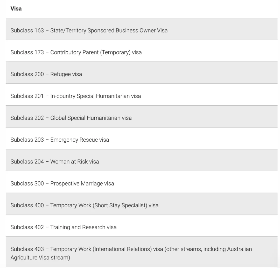 要被視為合格的簽證持有人,必須持有以下簽證之一。如果已申請簽證但尚未獲得批準(zhǔn),則不是符合條件的簽證持有人。符合條件的簽證類別包括: