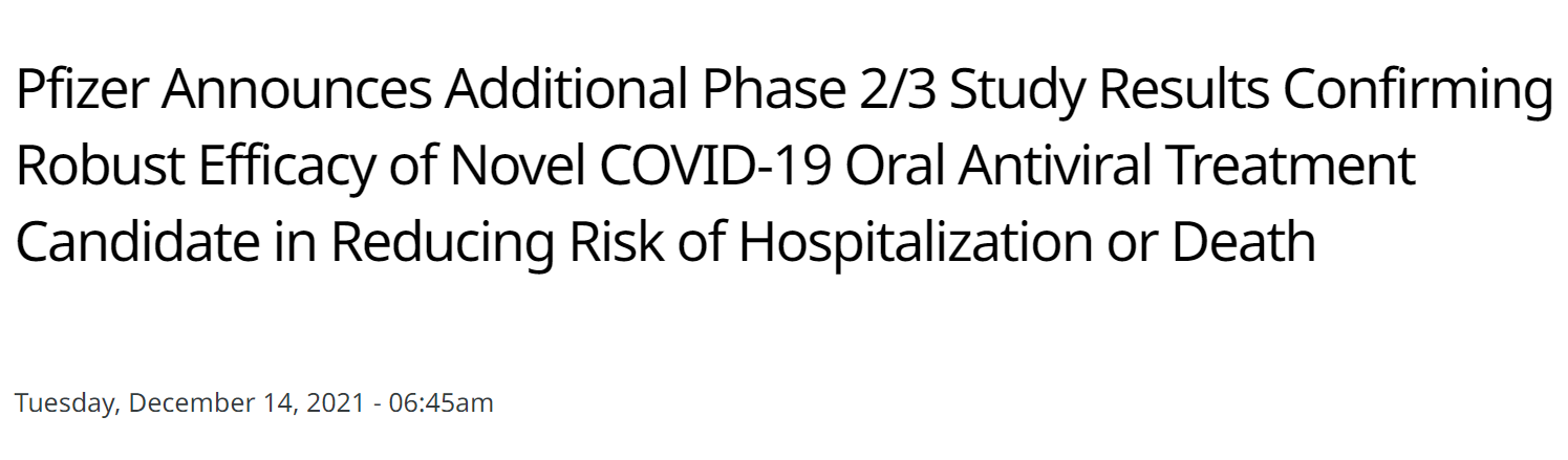 美國時間12月14日,輝瑞制藥(Pfizer) 公布了其新冠口服抗病毒藥物PAXLOVID的最終臨床分析結果,證實PAXLOVID在降低住院或死亡風險方面具有強大的療效,且該口服藥對快速傳播的奧密克戎變體也仍然有效。
