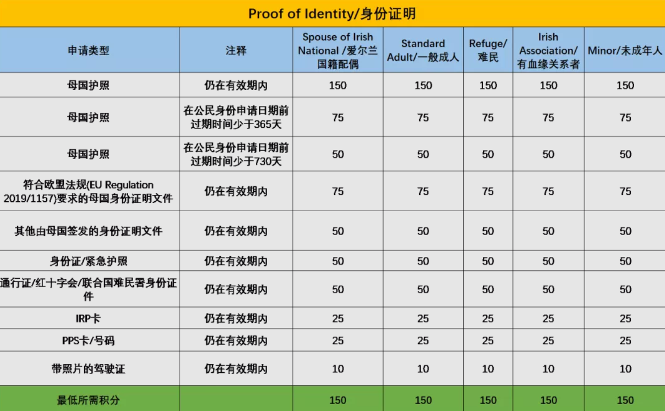積分制的引入,使申請(qǐng)人更加明確需提供哪些文件證明,以成功獲取公民身份。根據(jù)愛(ài)爾蘭移民局官網(wǎng)公布的積分細(xì)則,申請(qǐng)者需要在身份認(rèn)證(Identity)和居住證明(Residency)兩方面均滿足每年150分的積分要求。