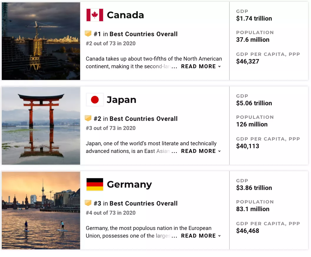 同時,在今年US. News & World Report聯合BAV Group和賓夕法尼亞大學的沃頓商學院,發布的最佳國家排名(Overall Best Countries Ranking)中,加拿大位列第一。