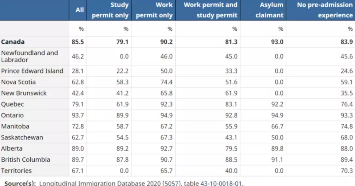 在加拿大工作或學習的經歷會影響移民在不同地區之間移動的決定。尤其就業是留住人才的關鍵,有工作許可的移民保留率達到90.2%。