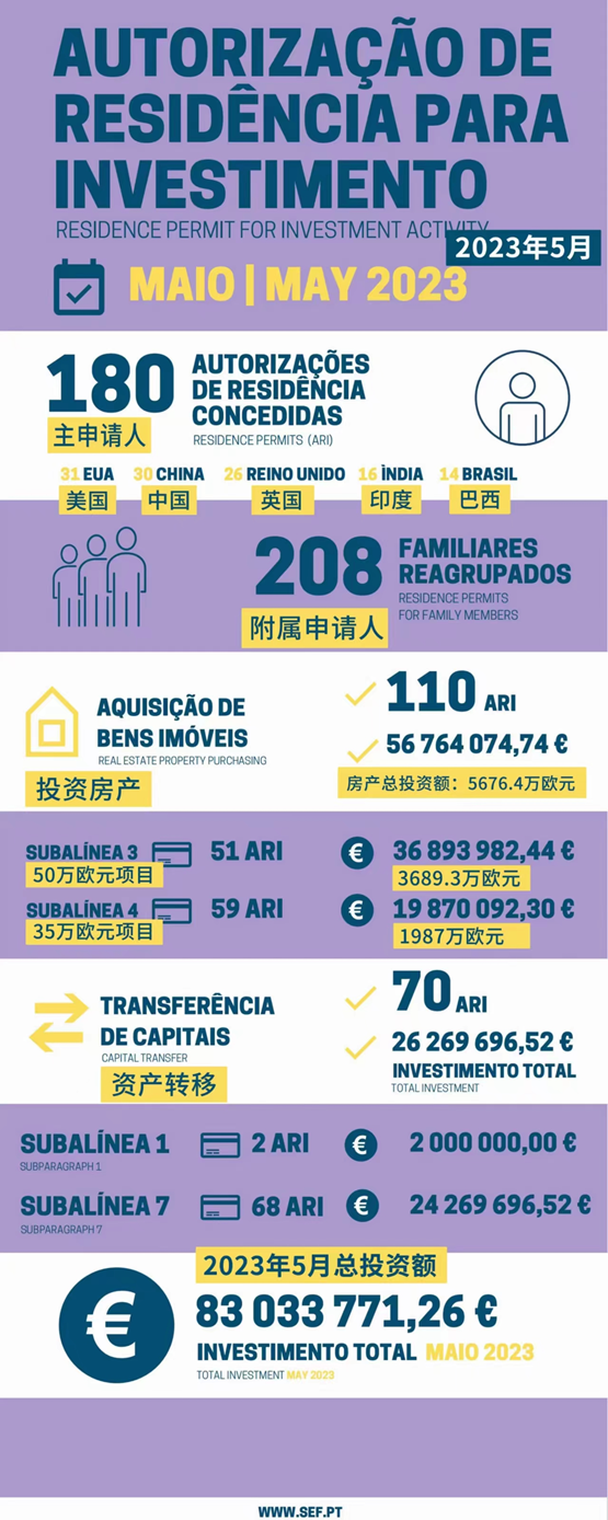 葡萄牙移民局(SEF)正式發布了5月的黃金簽證統計數據。5月共有180位主申請人和208位附屬申請人獲批葡萄牙黃金簽證。獲批總人數為388人,總投資額約8303萬歐元。