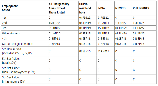 EB-3:技術(shù)類專業(yè)勞工排期為2019年4月1日,無變化;非技術(shù)勞工排期為2015年9月1日,前進(jìn)139天