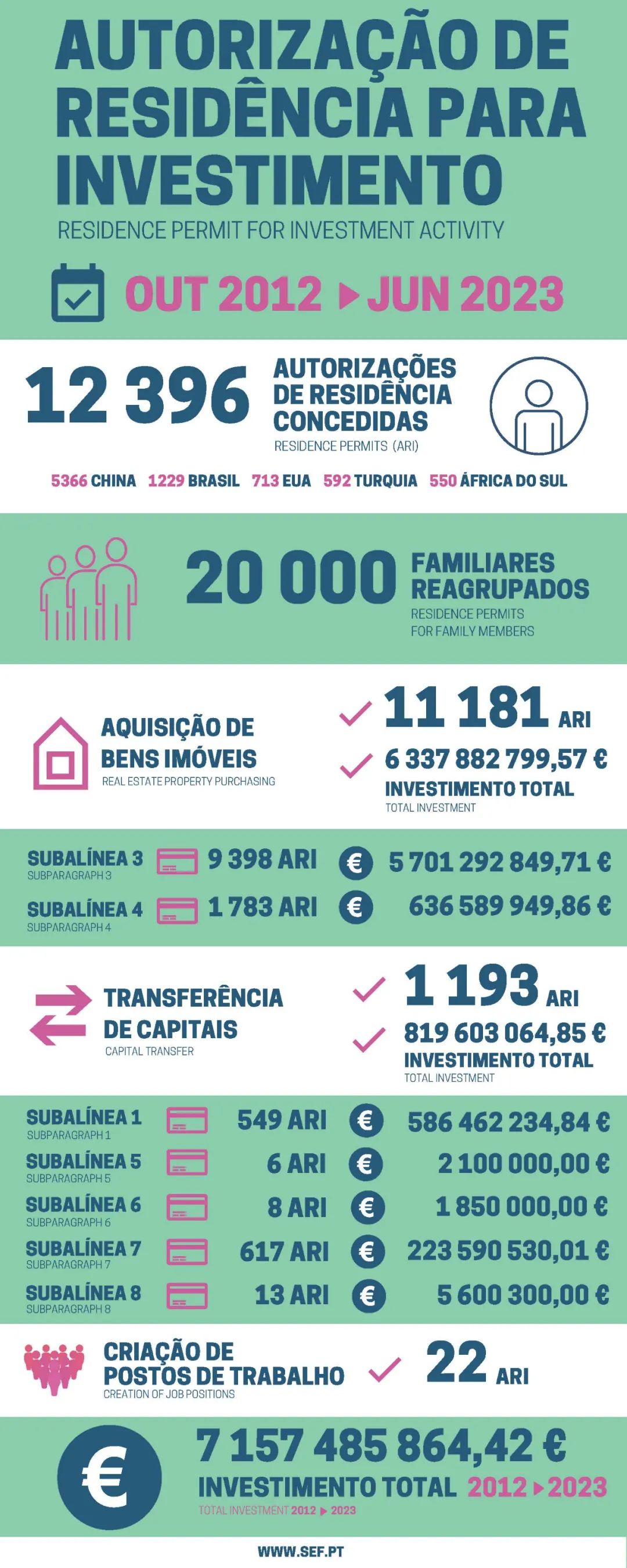 7月5日葡萄牙移民局(SEF)公布了2023年6月份的黃金簽證數(shù)據(jù)。6月共有179位主申請人和192位附屬申請人獲批葡萄牙黃金簽證。獲批總人數(shù)為371人,總投資額約7988萬歐元。