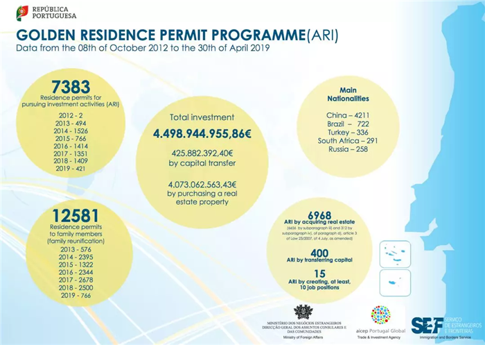 葡萄牙移民局(SEF)發(fā)布截至2019年4月30日“黃金簽證”大數(shù)據(jù):
