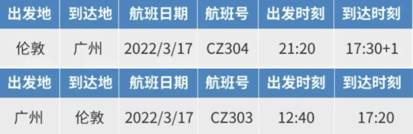 首班「倫敦-廣州」直飛CZ304將于3月17日英國時間21:20由希思羅機場起飛,次日17:30抵達廣州白云機場。