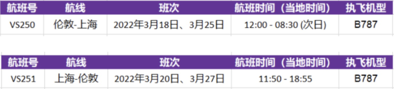3月「倫敦-上海」試運營VS250分別在3月18日及25日—當日12:00起飛、次日08:30抵達。