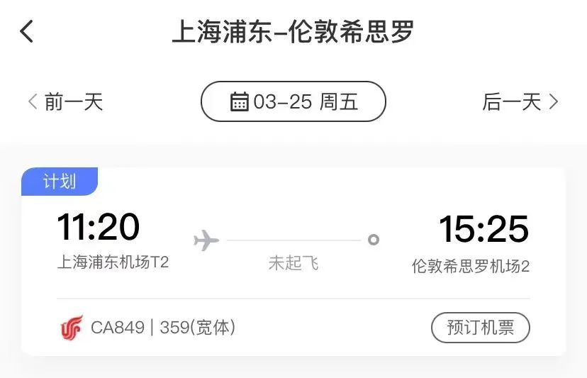 根據國航預訂系統,CA850航班將于英國當地時間3月25日17:30從倫敦起飛,北京時間26日中午12:40到達上海。