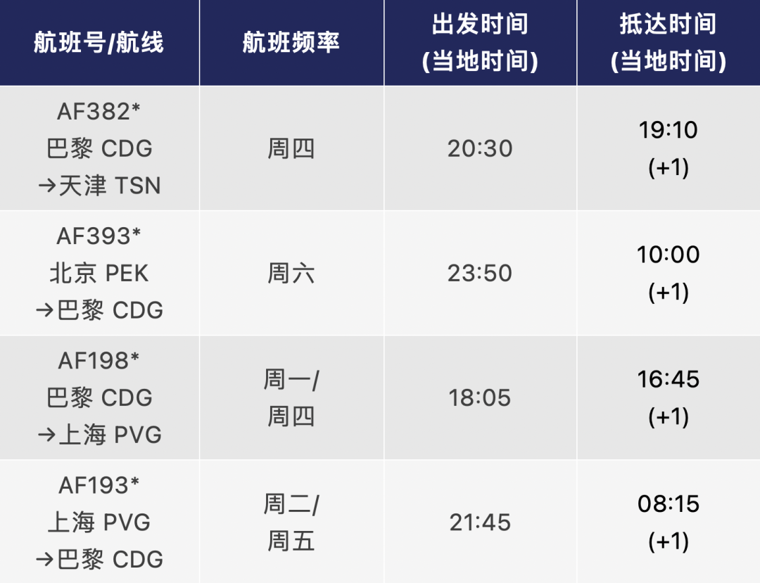 圖為法國航空赴華航班時間表