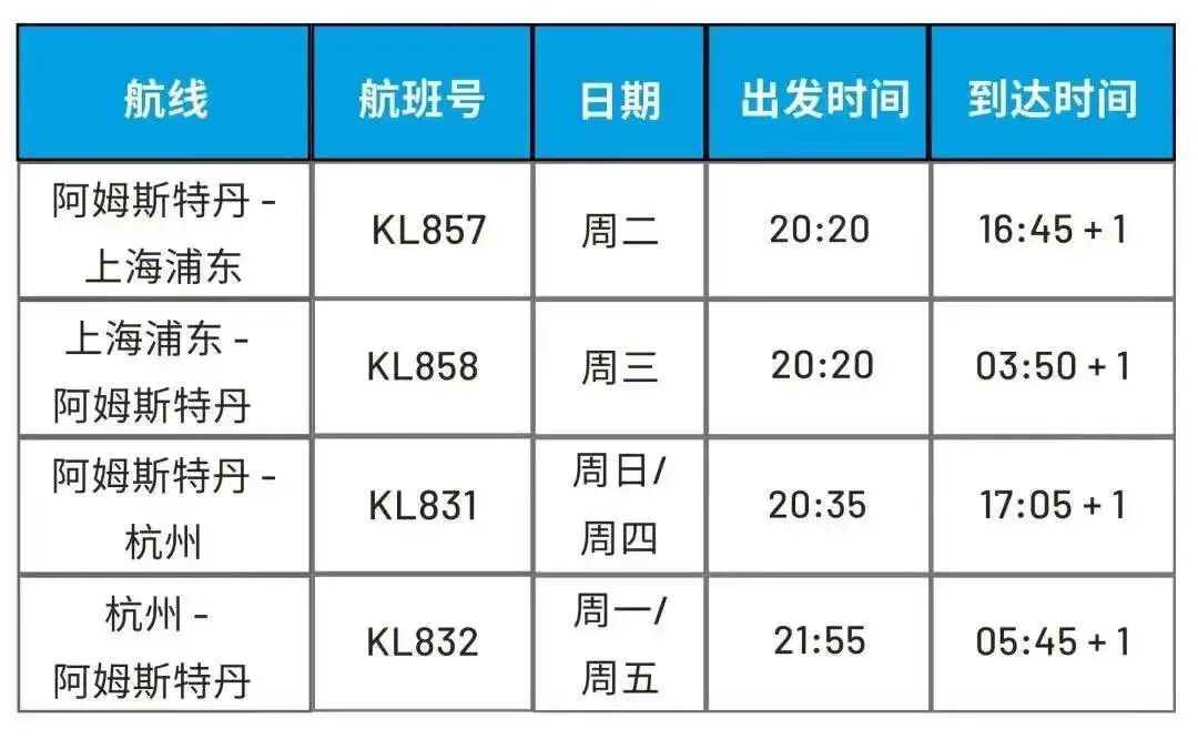 圖為荷蘭皇家航空赴華航班時間表
